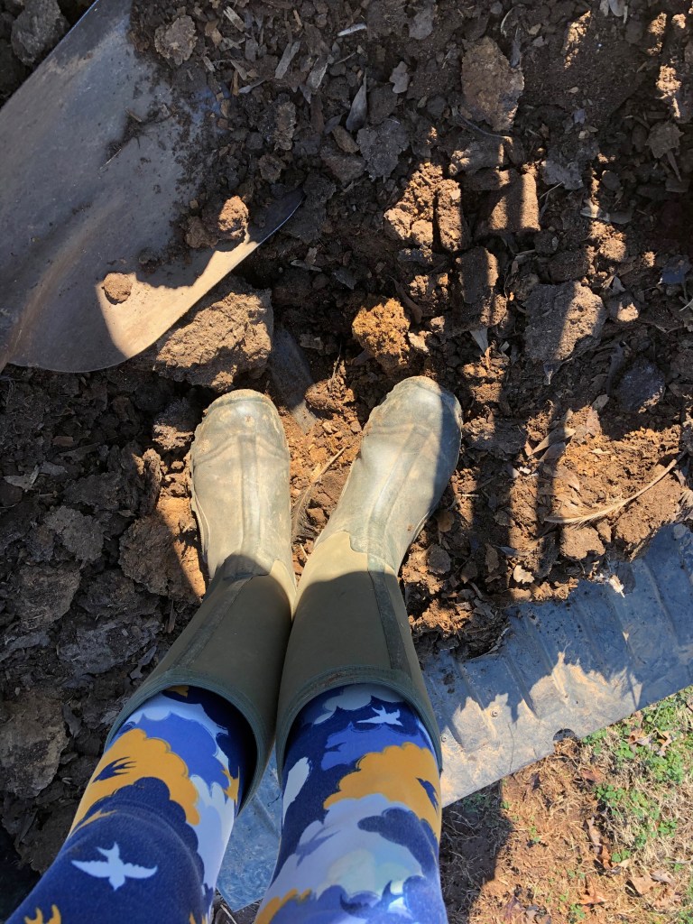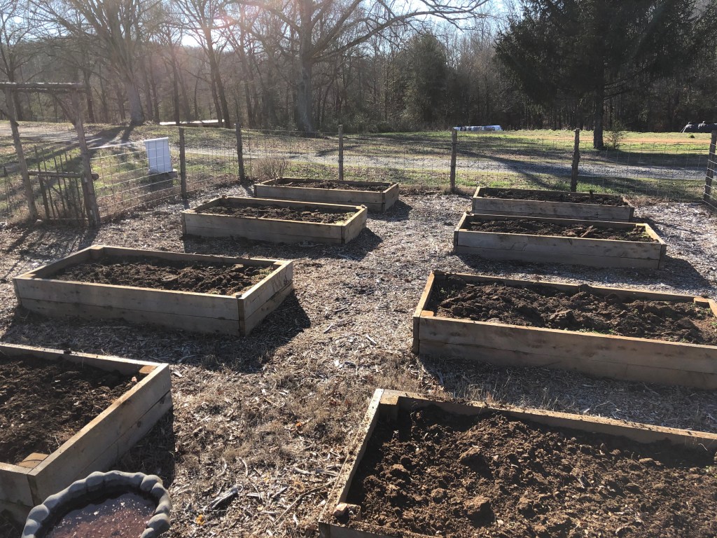 Sunday afternoon brought the sunshine and hard work. Loads and loads of chicken manure were scooped and hauled to the garden to fertilize the boxes. The coop looks great, the run is cleaned up, and fresh bedding is spread, so the chickens should be happy.