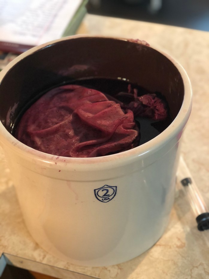 Now, for the blackberry wine! Winemaking is a new undertaking for me, so by no means am I an expert. This May I started a one-gallon batch of strawberry wine and I think I am hooked! I loved it so much that I started a 3-gallon batch of peach wine too. Once I picked the blackberries, I had give blackberry wine a try too! For all of the recipes, I am using a handy little book I got on Amazon titled Winemaker’s recipe handbook. It is by Raymond Massaccesi and so far, it has been a great resource.